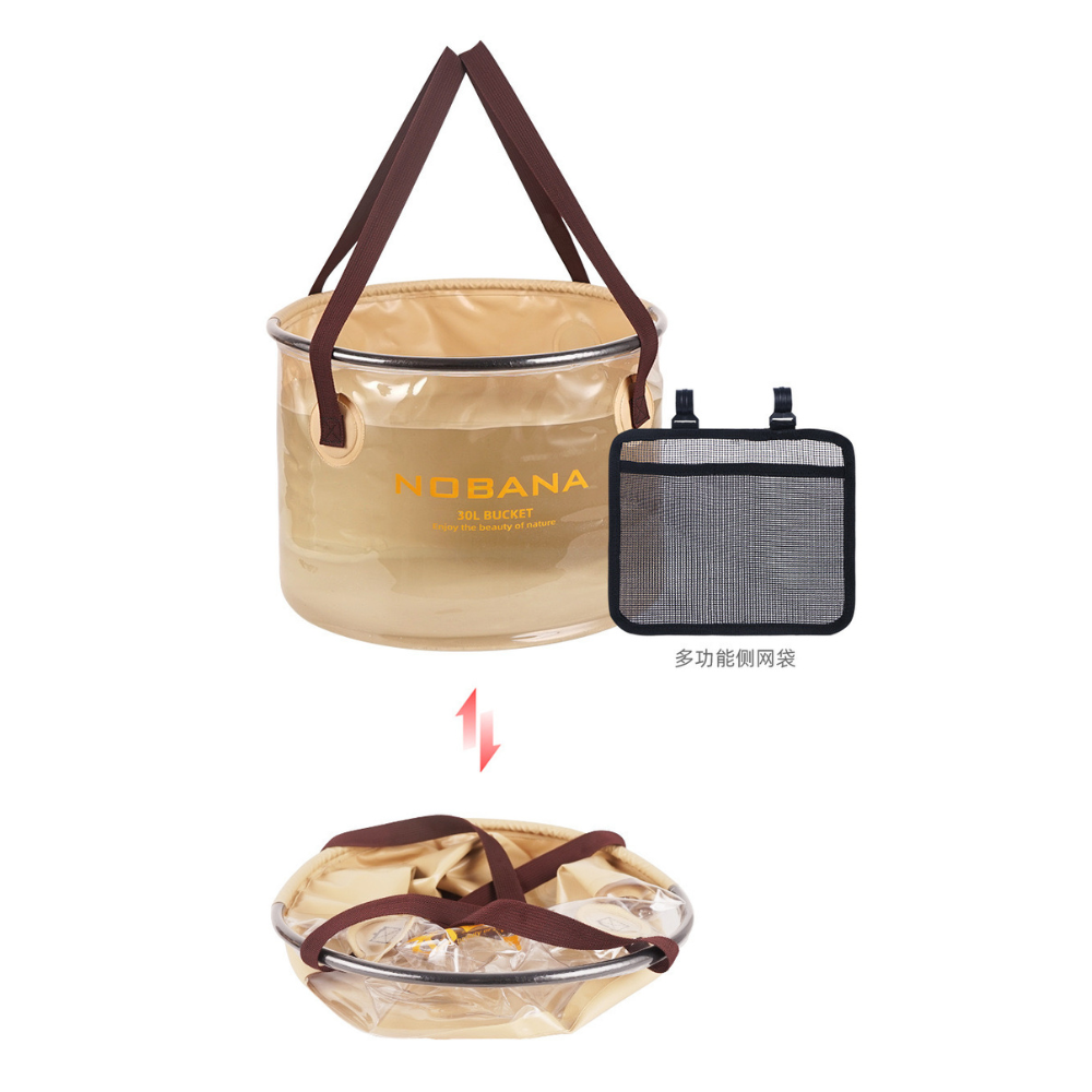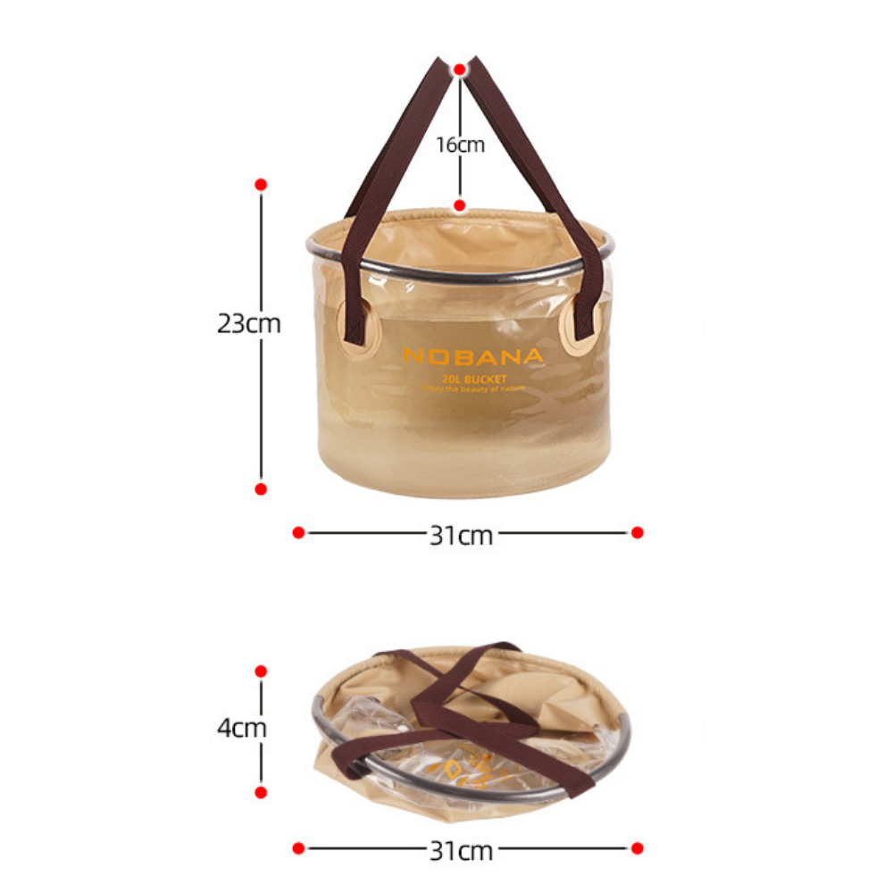 この折りたたみ式バケツは、20Lの大容量でありながら、たたんでコンパクトに収納できる優れものです。使わない時は場所を取らず、持ち運びにも便利です。また、クリアな素材で中身が一目でわかるので、水を入れたり、洗剤を混ぜたりする際にも便利です。キャンプやピクニック、釣りなどのアウトドアシーンはもちろん、家庭での掃除や洗濯にも活躍します。使い勝手の良さとコンパクトさが魅力のバケツです。