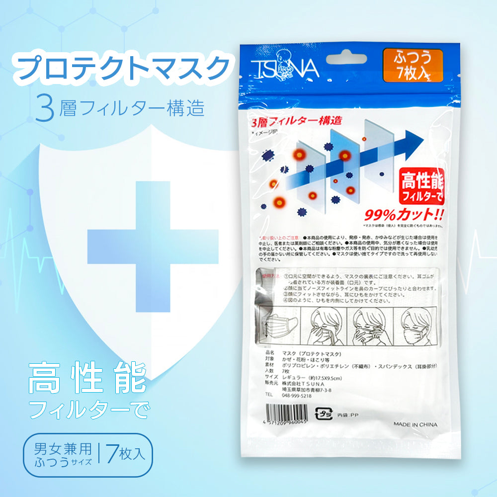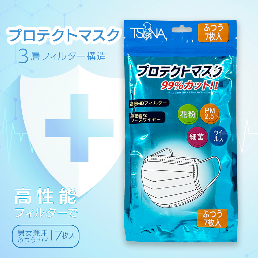 TSUNAプロテクトマスクふつう(7枚) 99%カット 3層フィルター構造 使い捨て不織布