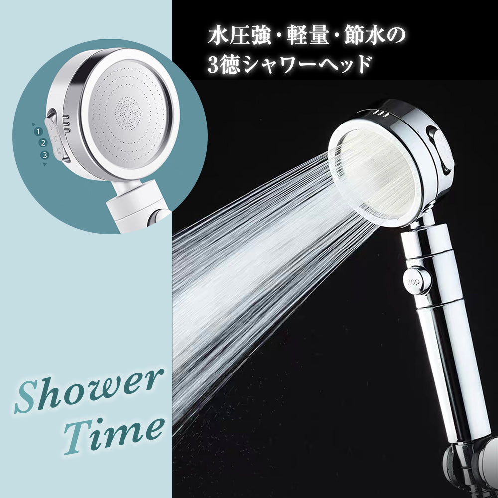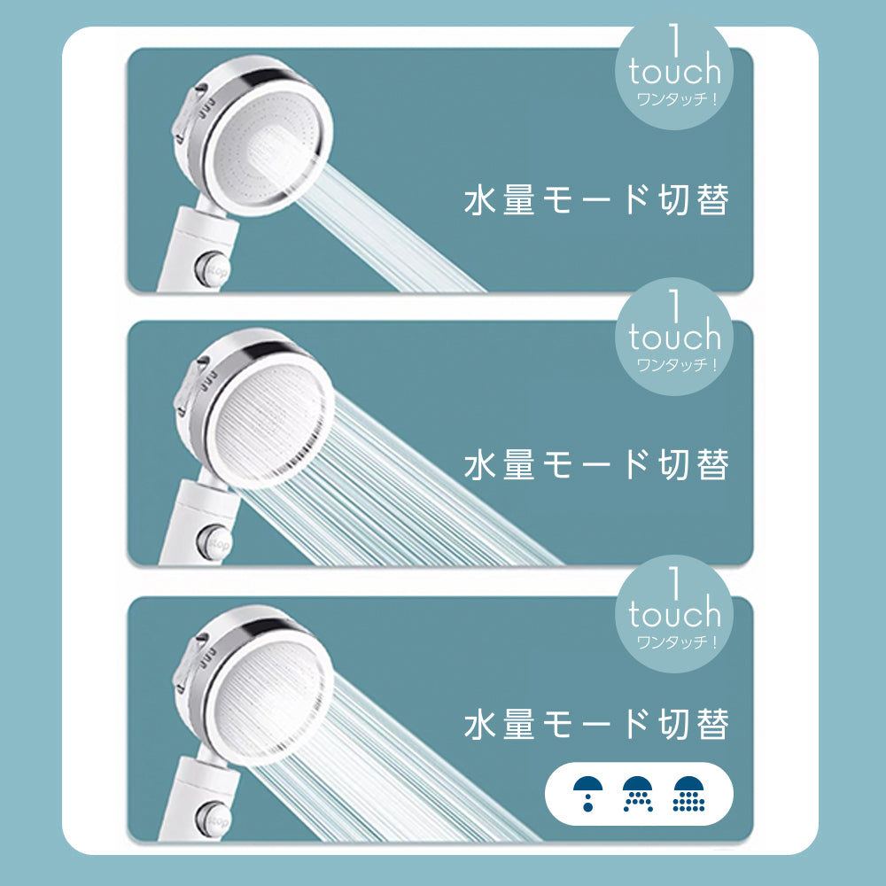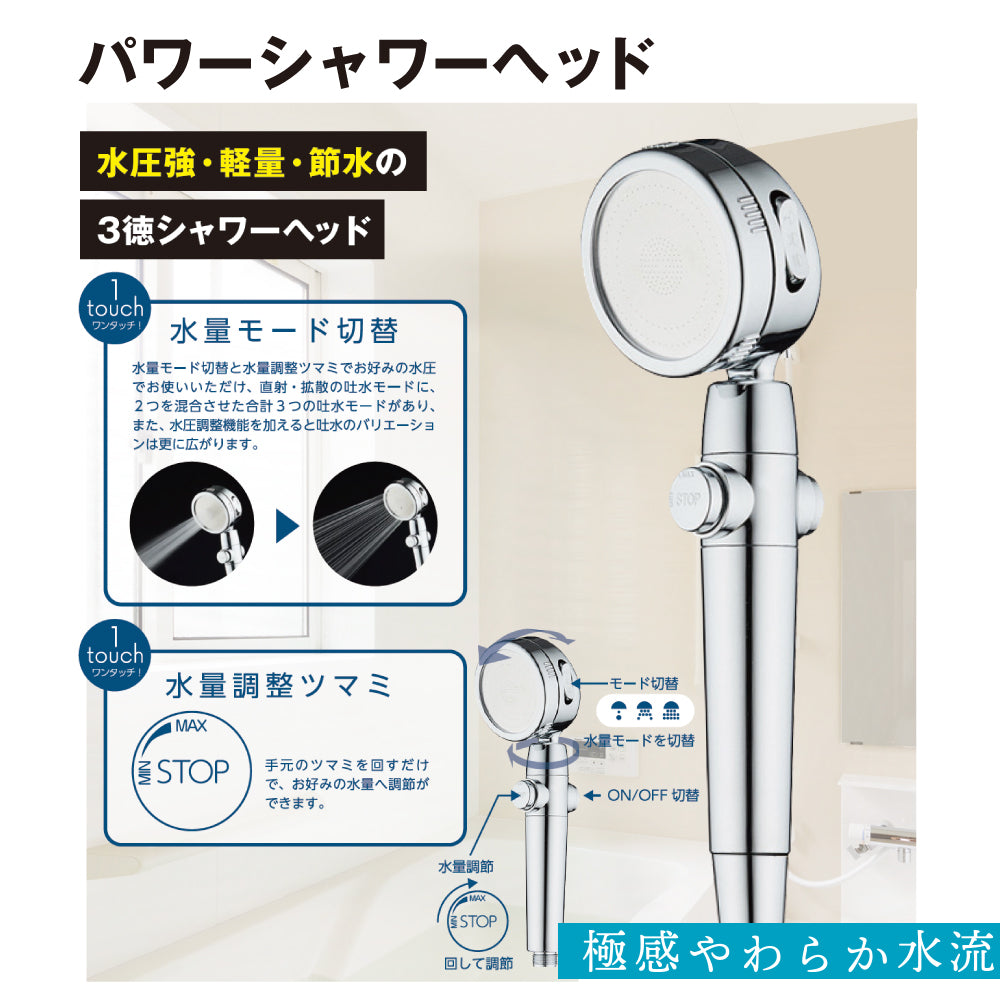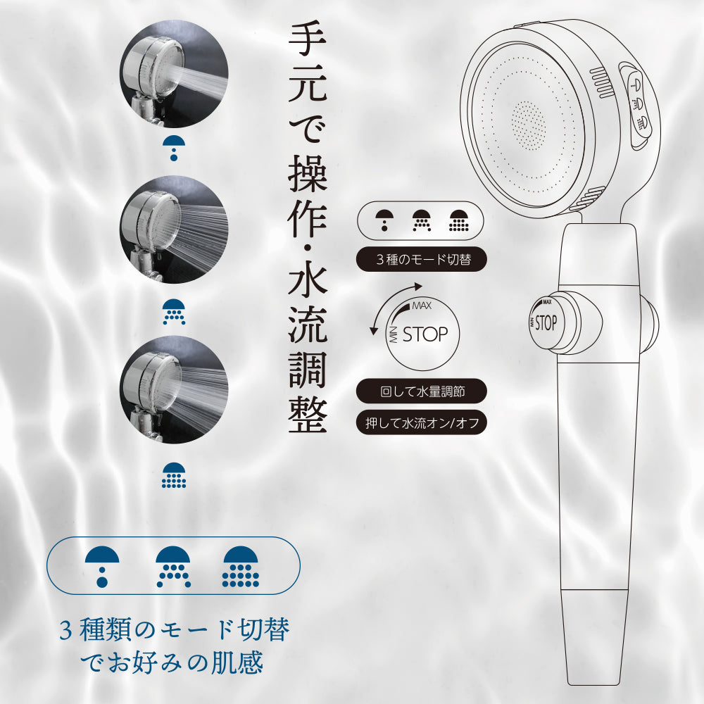 強水圧・軽量・節水の3徳シャワーヘッド。水量モード切替と水量調整つまみでお好みの水圧でお使いいただけ、直射・拡散の吐水モードに、2つを混合させた合計3つの吐水モードがあり、また、水圧調整機能を加えると吐水のバリエーションは更に広がります。水量調整ツマミ。手元のツマミを回すだけで、お好みの水量へ調整ができます.