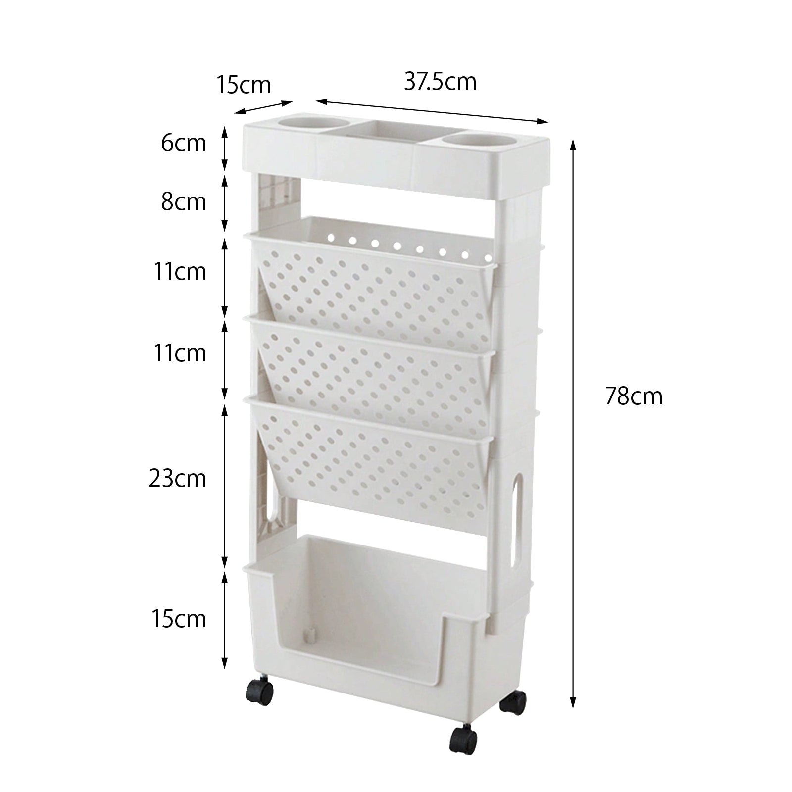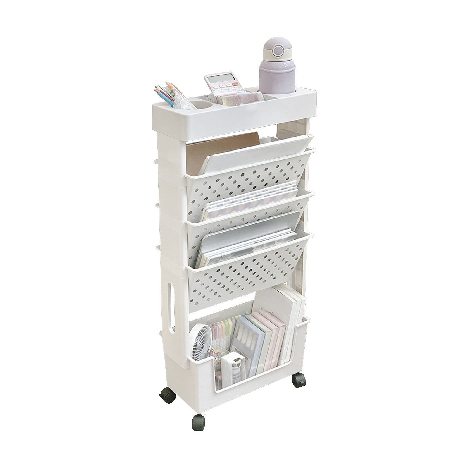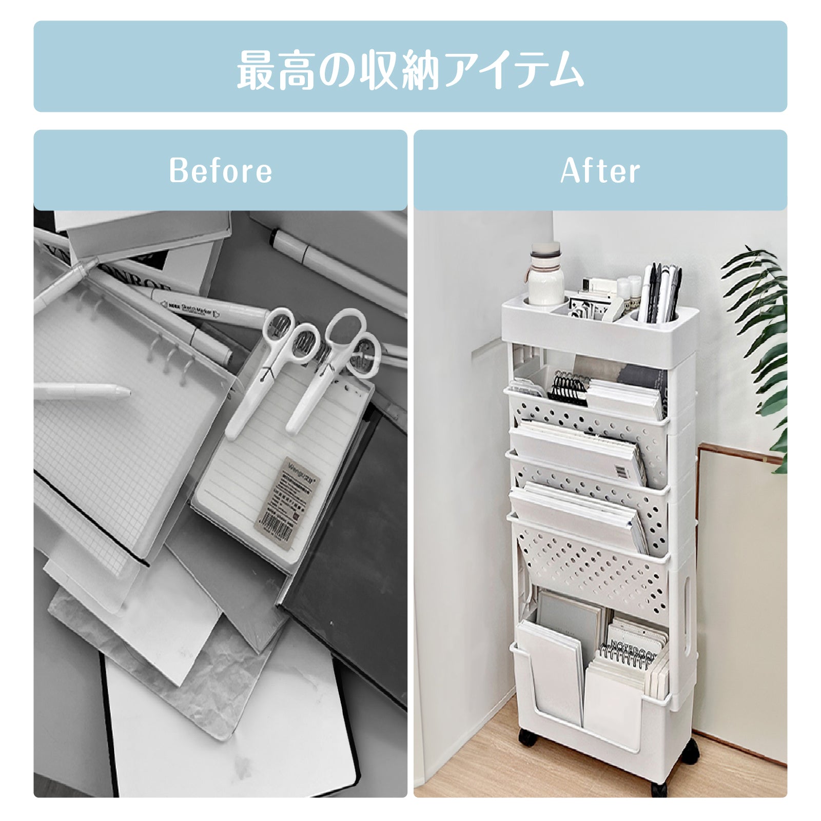 5段の仕切り構造で、書籍、雑誌、ノート、ファイル、辞書、文具、料理本などをコンパクトにまとめて収納可能。上と下のトレイ部分には、水筒や文房具、小物類も置けて便利です。スリムな見た目ながら、約30冊の本が収まり、デスク周りがすっきり整います。【組み立ても超~~簡単!】