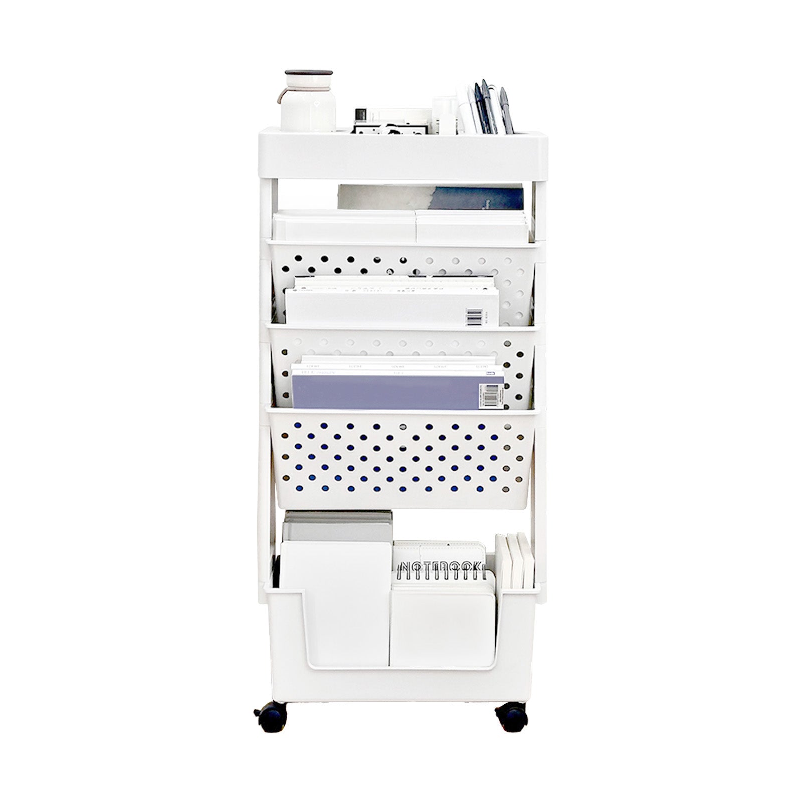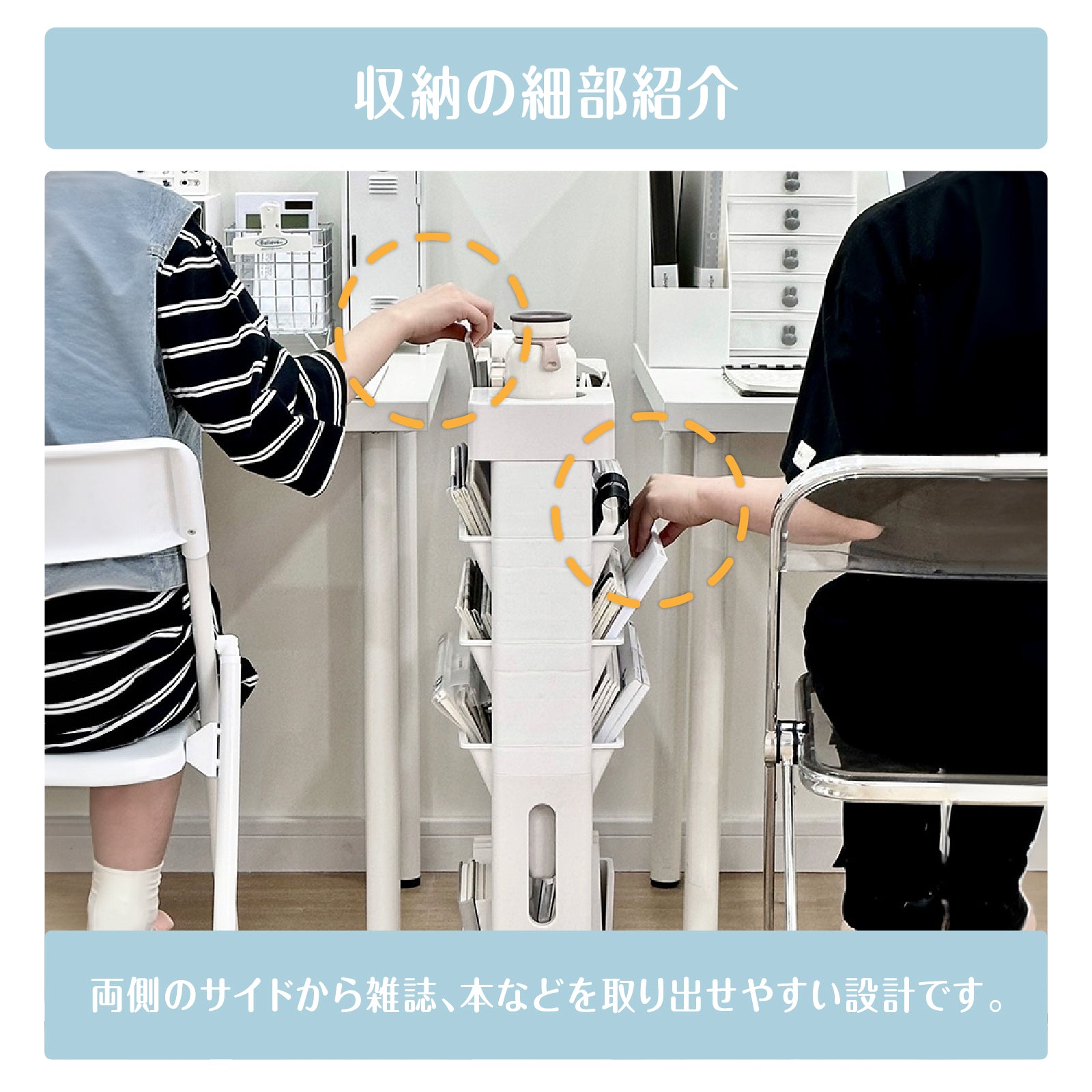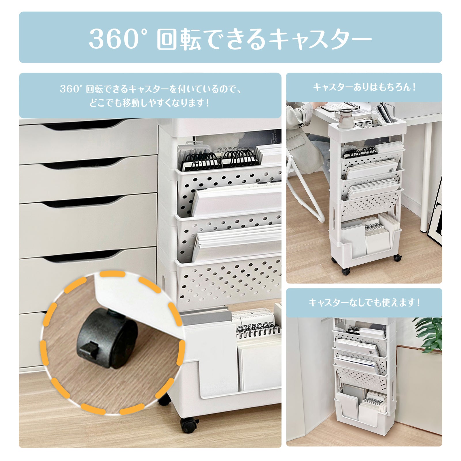 360度回転するキャスター付きで、ワゴンを簡単に移動できます。重い本をたくさん載せた状態でもスムーズに動かせ、床を傷つける心配もありません。ロック付きなので、使わない時はしっかり固定可能です。【色々なシーンに使える多機能スリムワゴン】