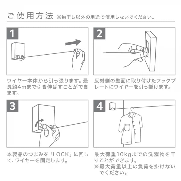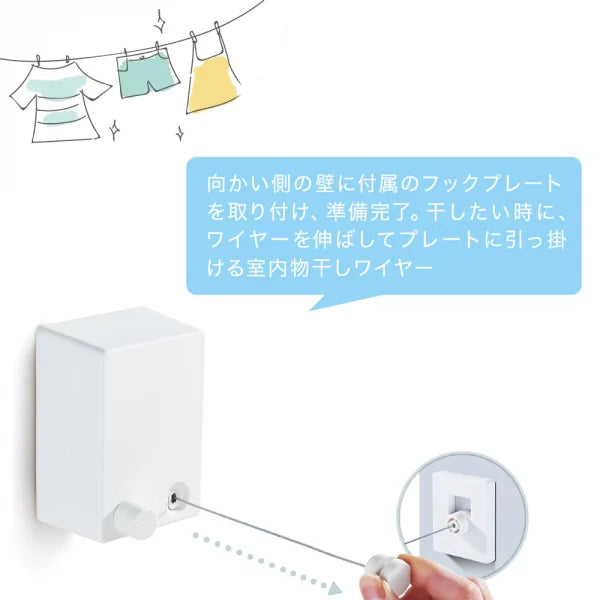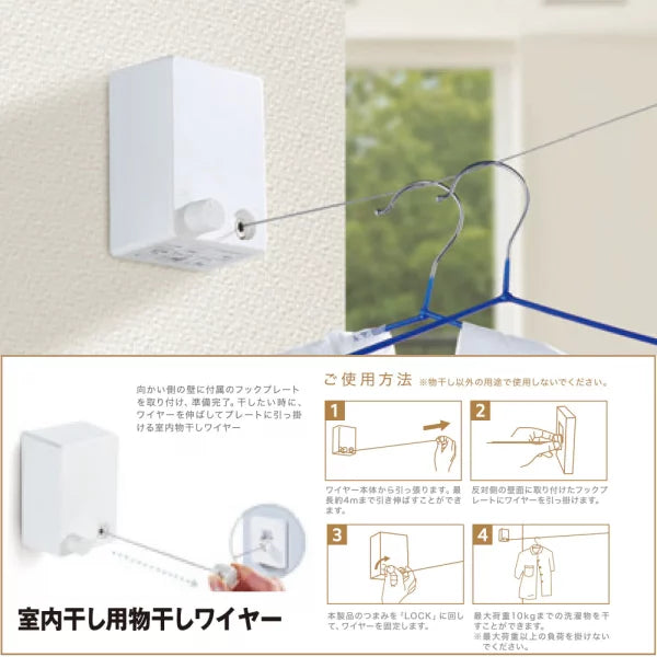 室内干し用物干しワイヤーは、取り付け作業が簡単で、目立たず、使いたい時だけワイヤーを伸ばしてお洗濯物を干せる便利なアイテムです。室内干しをする方にとって、場所を取らずに効率的に使えることが魅力となっています。取り付けは簡単で、壁に簡単に取り付けることができます。また、目立たないデザインなので、インテリアにも馴染みます。お洗濯物を干す際は、ワイヤーを自由に伸ばし調節することができ、干したいものに合わせて使い勝手良く利用できます。室内でのお洗濯を快適にするために、ぜひ室内干し用物干しワイヤーをご利用ください。