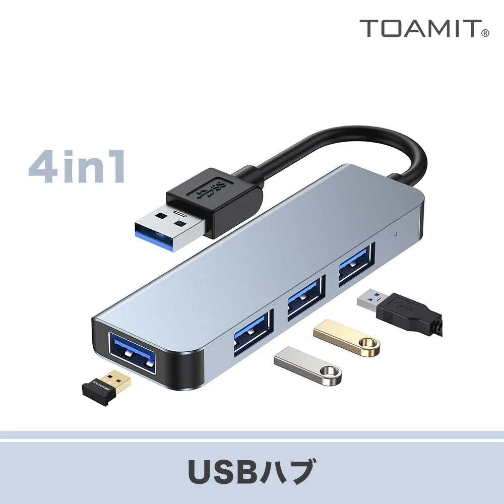4in1USBハブ 持ち運び便利 スリム 前面3ポート サイド1ポート 使い勝手抜群