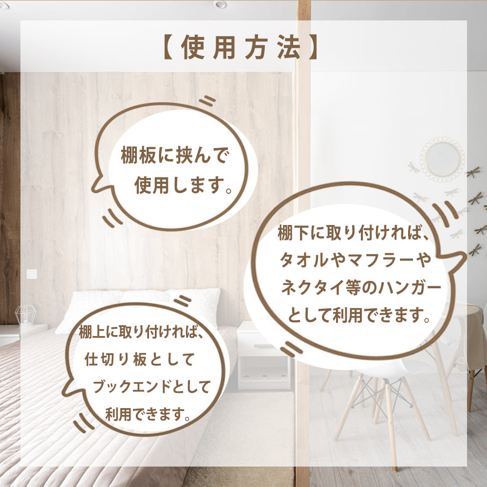 【選べる2色】間仕切りハンガー板は、使い方いろいろで便利なアイテムです。ネクタイやマフラーなどを上手に収納するためには、吊り下げることがおすすめです。ハンガー板をクローゼットの棒にかければ、縦に収納することができます。また、棚の上に取り付ければ、間仕切りとして活用することもできます。2色から選べるため、お部屋のインテリアに合わせて選ぶことができます。使い方は自由自在で、整理整頓を手軽にサポートします。ぜひお試しください。