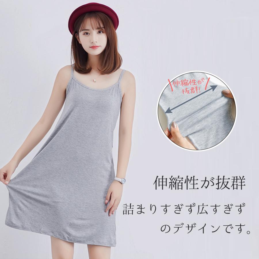 シンプルなデザインだから肌着として、透け防止、おしゃれレイヤードなコーデとしてもOKなキャミワンピ。