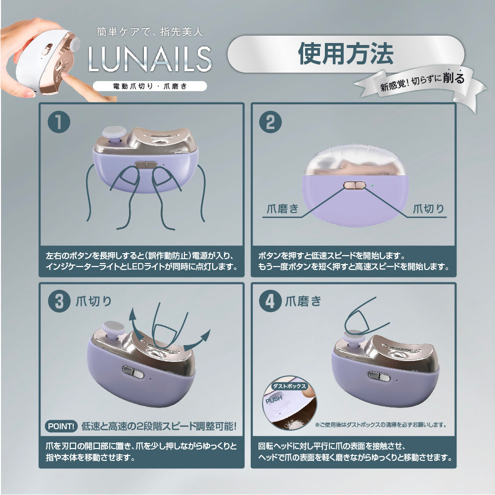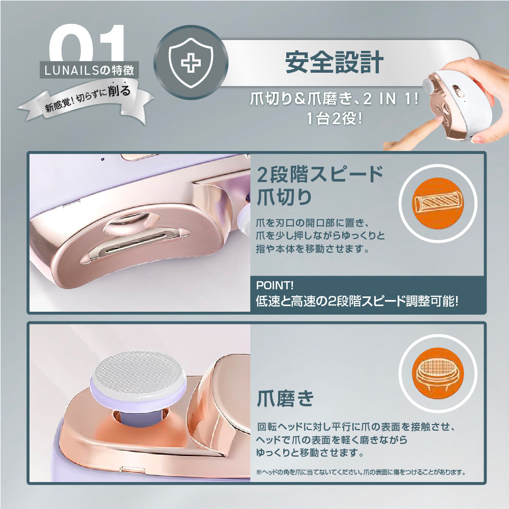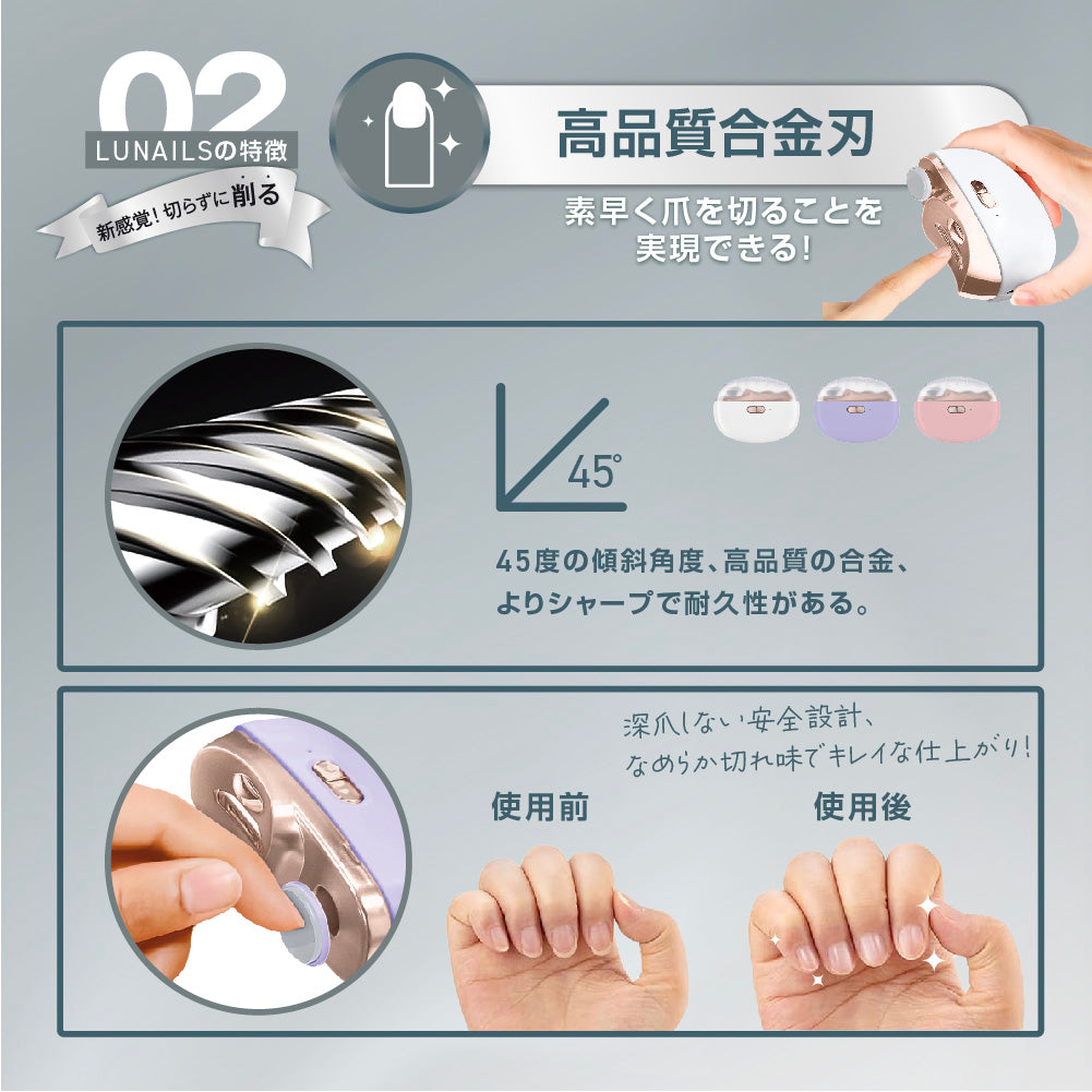 高度な電気モーター技術と高速刃で爪を削るように切り、電動の爪磨きにより滑らかに爪を整えることができます。