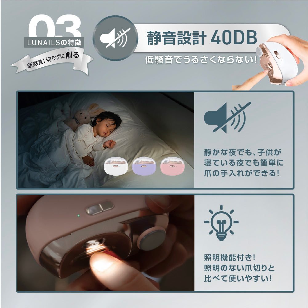 ボタンを押すだけで爪をカット&滑らかに整える電動爪切り。刃が直接触れない安全設計で、小さなお子様やご高齢の方も安心して使えます。静音設計なので、夜間やお子様が寝ている間の使用も快適。